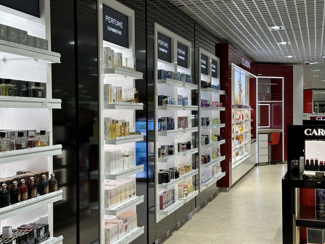 The store is divided into two parts. You will find premium alcohol, wines of Georgia, France, Italy, Spain, imported beer, soft drinks, tobacco products in the first one. And also you can choose perfumery, make up and skincare products of well-known brands (Chanel, Dior, Clinique, Clarins, etc) in the second part.