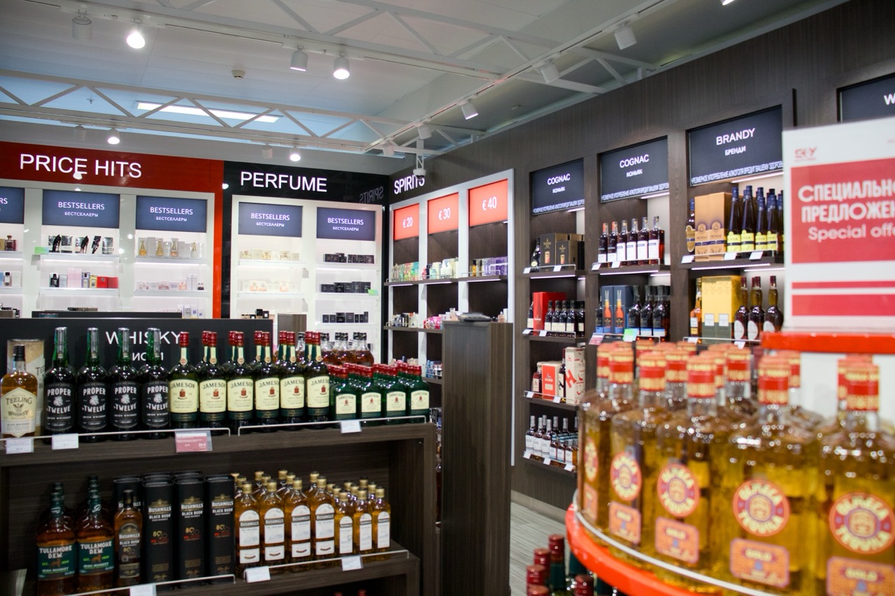 The shop is located in the arrivals area of international flights. It offers an assortment of imported alcoholic beverages, tobacco products, perfumes, chocolates and toys.